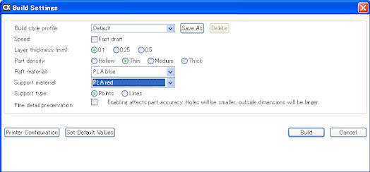 | Speed | Fast draft | Speadでドラフト(Fast draft)をチェックすると、ピッチや中味の選択が出来なくなる。 造形は、0.25mmピッチとなり、中味は空洞と薄めの中間となる。造形物内部には10mm間隔の壁を造形 2013/08/18測定 PLA:15.0mm ABS:10.0mm |