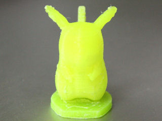 | Curaでの造形設定にも慣れたが、まだまだ品質向上の手立てがありそうである。 | フィラメントの径が1.75mmであるので、同一造形データであるので、より引き締まった造形となるが、問題なく造形出来る事が確認できる。 ABSであるので、反りの問題や造形中も積層物が柔軟に揺れ動くなどの課題もあるが、同一の温度設定で造形できるので利用し易い。 (2014/02/14) こちらのABSのフィラメントの使用時は、もう少し溶融温度を下げるべきだろう。 純正品のPLAのフィラメントは、やはり怪しい。 |