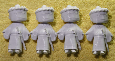 造形時間2時間11分、5.7g(+1.5gラ・サ)、簡易サポート除去状態。 やっぱり肩の出来が悪いので、もう少し速度を落として造形した方が良さそうであるが、ディテールはこれ位は出るよ。 Z軸の昇降時のガタを何とかしないと、縞々は消えそうにないね。確か消しゴムを挟み込めば安定化する筈。 |