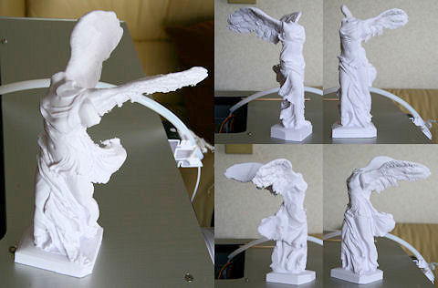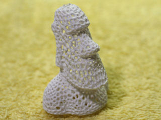 うまくいっていると思ったが、そう見えていたのはファンの風が当たっていた左側の顔だけで、右側は悲惨な状態であった。また、外形が一軌跡分だと強度不足の為、中味の形状の影響が表に出てしまう問題もある。 鼻の出来は今までの造形の中で最も良い状態であるけれど、冷却効果に偏りがある状態となってしまった。 次回は、顔の正面にファンの風が当たるように配置角度を変更しようと思う。 この結果からすと冷却は少なくとも左右の二箇所以上から行うようにした方が良い事が分った。 そういえば、二方向からの冷却用ファンを備えたと謳う造形装置が発表されていたっけ。 |