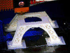 | 造形時間:約4時間00分、7.3g。一応、最後まで造形。 やっぱり、支えがないと厳しいね。これだけ細いもので高さのある物は、ABSの柔軟さでノズルの動きにつられてしまう。 |