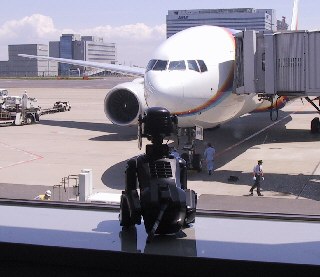 JASでも、¥3,000位でロボットのマスコットを販売するとのことです。(搭乗員さん談) 一応、電子機器になるので、離陸と着陸時は電源を切る必要があります。流石に機内は狭いので、遊び回るには無理がありました。こんな時は、擬似ステーションモードが有効でしょう。 |