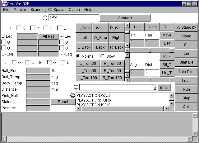 注) "Quit"ボタンを押した場合は、以後のコマンド処理を正しく受け付けなくなるようなので、AIBO側を再起動する必要がある。