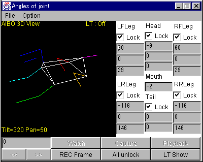簡単なラインでの動作アニメーション表示を組み込む。(何時かはソリッドモデル化) 当然、視点変更もできる。また、200フレームの蓄積機能を設け、Playbackができる。(1フレームおよそ0.1秒だが、リターン値は1〜2秒かかる様だ。)
