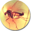 プラスチック中の昆虫の拡大写真。足が不自然に曲がり、羽の広がり方も自然ではない。またゾルである殺虫剤が用いられたらしく、全体に立体感が乏しい(殺虫剤を吹き付けた蚊を想像して欲しい)。
