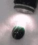 グリーンに染色したカルセドニー。写真上は通常の色。カラーフィルターを通してみると赤色に見える(下)。