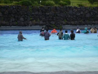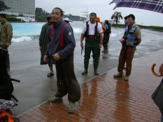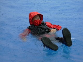 | 雨にも負けずいよいよ入水 | 腰まで浸かる深さまで |