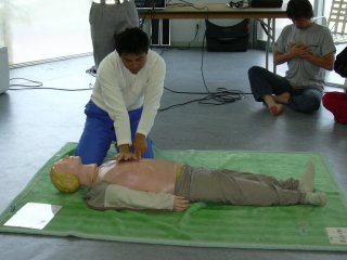 | 心肺蘇生法の実演 | 心臓の位置を確認 |