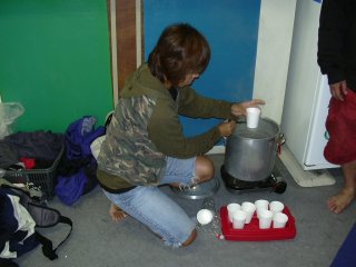 | 温かいスープが振舞われ | 地元の大御所 原田さんから |