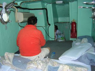 | キャビン内の様子 エアコン完備でゆったり寛げる船内でございます。 下田港までは就寝タイム。 無事に下田港着↓ 雨が本降りでございます。 皆さんお疲れ様でございました。 |
