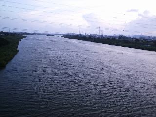 | 銀河大橋上から下流に向けて 銀河大橋上から撮影 手前の送電線がちと気になりますが・・・。この下に中洲があります。 撮影日 2000年9月9日 茅ヶ空ミニ撮影会にて |