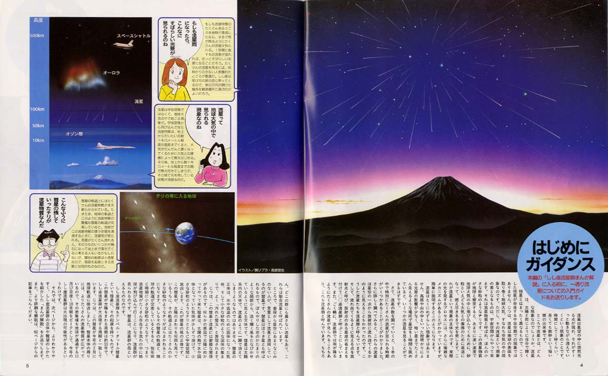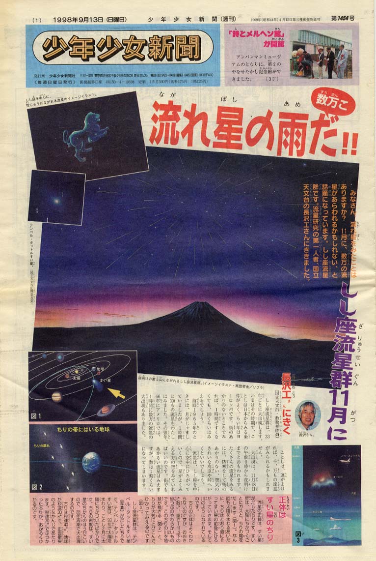 ・少年少女新聞 1998年9月号 〜富士山をバックに流れるしし座流星雨です。 |