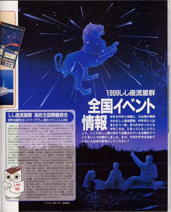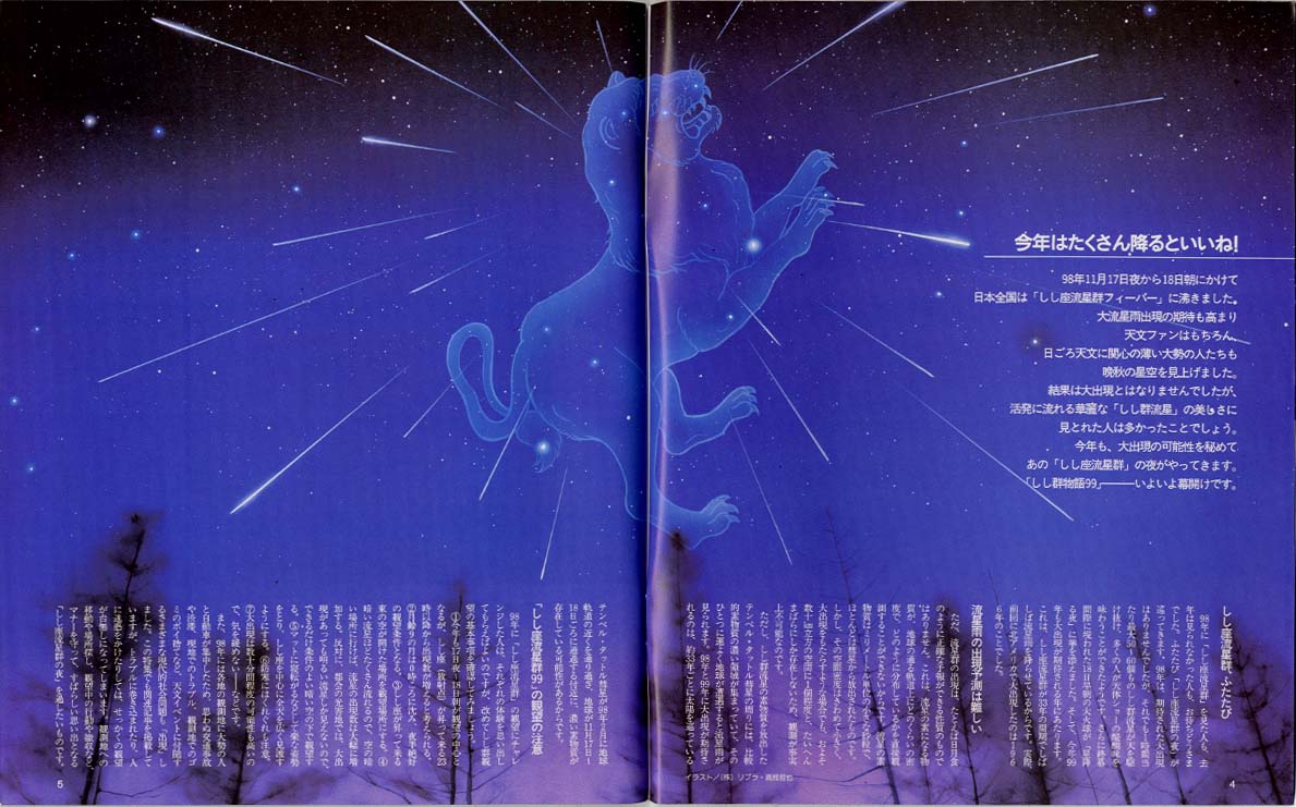 ・スカイウォッチャー 1999年11月号 〜しし座流星群の特集に、しし座を中心に流れる流星雨の想像図が 掲載されました。 |