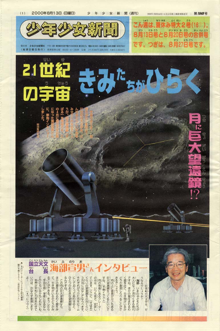 ・少年少女新聞 2000年8月号 〜未来の月面基地に作られる月面天文台構想の想像図です。 |
