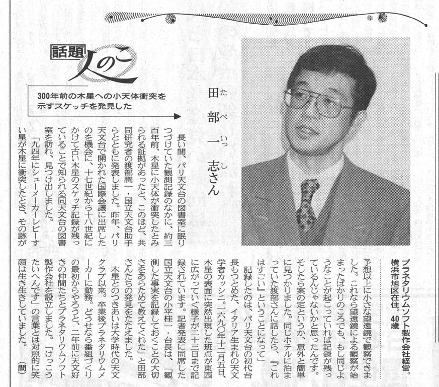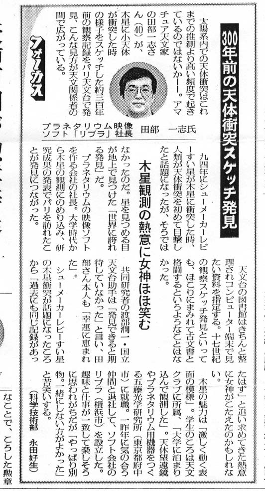 ・赤旗 1997/1/8 〜弊社代表取締役 田部一志が発見した木星への彗星衝突の記録について紹介しています。 |
