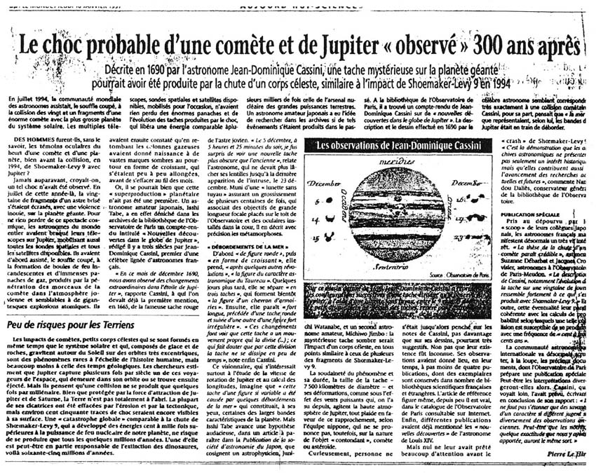 ・ル・モンド 1997/1/9 (フランス) 〜弊社代表取締役 田部一志が発見した木星への彗星衝突の記録について紹介しています。 |