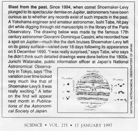 ・サイエンス 1997/1/17 (アメリカ) 〜弊社代表取締役 田部一志が発見した木星への彗星衝突の記録について紹介しています。 |