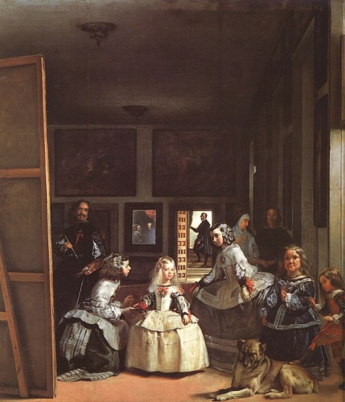 このように、この絵画のなかで視線はさまざまに交錯する。虚実混在の視線の交錯によって、この作品は立体的な存在感を放ちつづける。この作品の空間を走るいくつかの視線は、いまこの絵を観ているわれわれの視線、かつてこの絵を描いた作者ベラスケスの視線、モデルとしての王の視線、絵の外部にある一点に注がれている登場人物たちの視線、絵の作中人物でありながら画面の外部に位置し、画面を睥睨する国王夫妻の視線というように枚挙される。