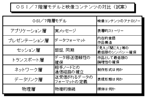そういった発想の背後には、ひとつのアナロジーのごときものが頭の中にあった。それは、コンピュータのデータ通信におけるOSI/7階層モデルだった。データ通信におけるOSI規格は、7階層のプロトコルを定義している(*9)。階層は下位に行くほど物理的であり、上位に行くほど論理的である。そして各階層は、それぞれ他の階層に対して責任をもたない。これは決して普遍的なモデルではないが、きわめて示唆をふくんだ寓意を含んだモデルである。
