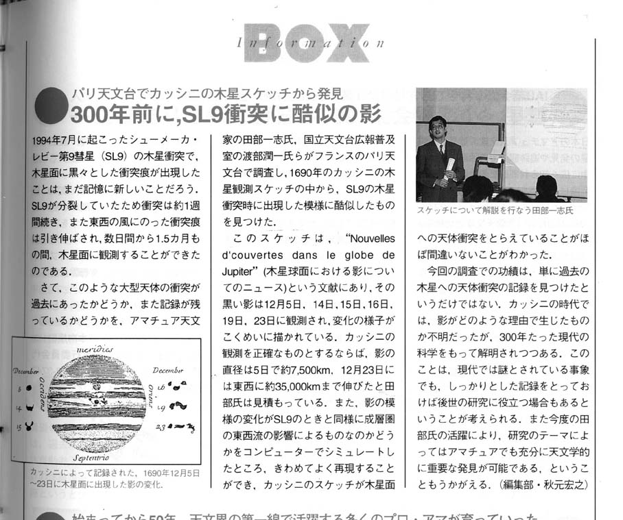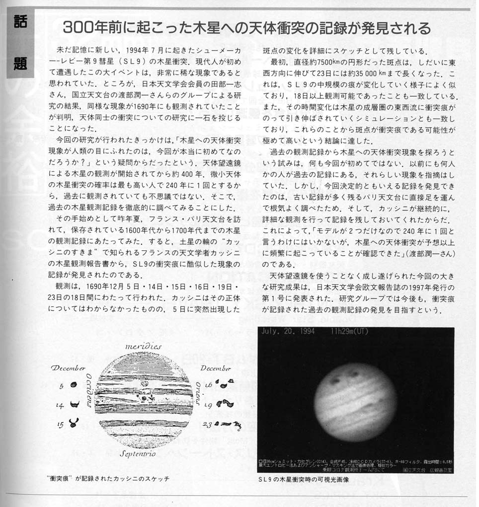 ・サイエンス 1997/1/17 (アメリカ) 〜弊社代表取締役 田部一志が発見した木星への彗星衝突の記録について紹介しています。 |