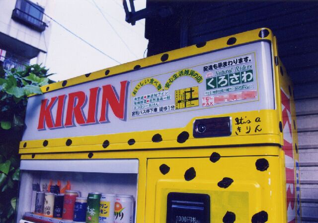 飲料メーカ「キリン」の自販機。機械もキリン柄なんてシャレれるよねー(笑)