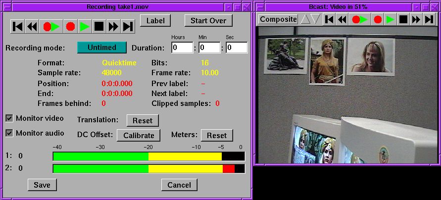 オーディオとビデオのどのような組み合わせでも記録できますが、一度に1つのビデオ・トラックのみです。記録するファイルのパラメータを指定し、Do it を押して下さい。ほとんどのユーザーは、フォーマット設定を理解するトラブルにあいます。これが Broadcast 2000 が標準フォーマット・ダイアログを使う理由です。After the file format is specified you're presented the recording engine.