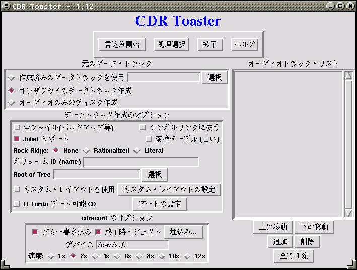 に書かれている内容を引用・翻訳し、詳細な使用方法の解説を加えたものです。CDR-Toaster日本語版プログラム cdrtoaster-1.12jRPMパッケージを作成してもよいのですが、面倒(といっても大した手間ではないが)なのでテキストのままです。ファイルが2つしかないのにパッケージというのもどーかなぁと思ったり。説明書にインストール方法が書いてあります。プログラムは、Tcl/Tk のスクリプト、すなわち単なるテキストファイルです。chmod +x コマンドで実行属性を与えないと動きません。