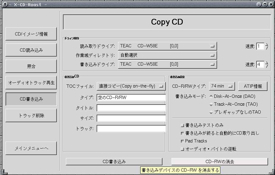 Gnome-Toaster http://gnometoaster.rulez.org/ というのも良さそうですが、まだ試していません。(1) X-CD-Roast (スクリーンショット:55KB)