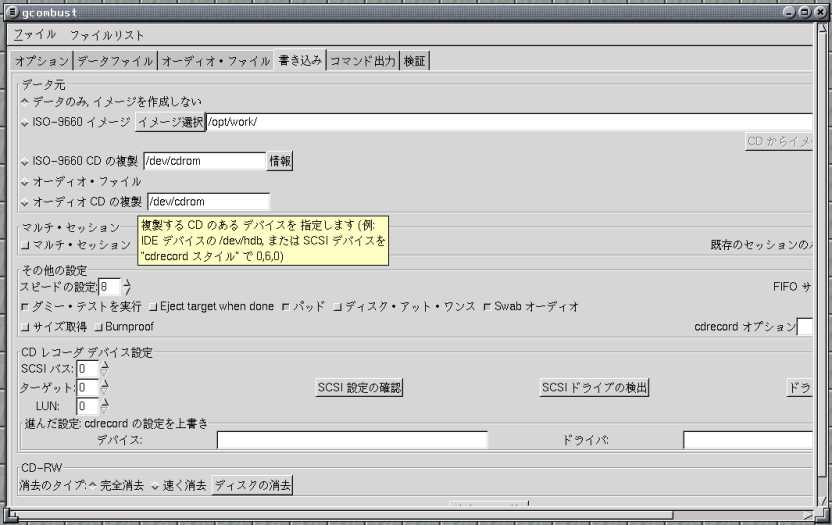 コマンドライン型の CD-R/RW 書き込みソフトには、ものすごく沢山のオプションがあり、とても覚えきれるものではありません。調べてみると世の中には GUI で CD-R/RW を焼くソフトが一杯存在します。下記のWebページで、様々なCD-R用ツールのフロントエンドを比較しているので、どれを使うか選択の検討材料になります。http://sites.inka.de/~W1752/cdrecord/frontend.htmlこれを見ると、なんと 20種類ほどあってどれが良いのか迷ってしまいます。GTK+を使ったもの、Qt/KDE が必要なもの、Tcl/Tk や Java で書かれたものと様々ですが、何れも mkisofs、cdrecord といったコマンドライン型のツールを呼び出すようになっているようです。私は日本語で表示できるものの中から X-CD-Roast と gcombust を試してみました。また CDR-Toaster という Tcl/Tk で書かれたソフトを日本語化してみました。