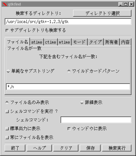 と入力しますが、オプションを忘れたりしがちです。このgtkfindは、これをグラフィカルな操作で行うものです。検索条件として、ファイル名、様々な日時(最終アクセス、最終変更、最終書き込み)、属性、種類(setuid, sticky, シンボルリンク、ソケット、その他)、所有者/グループ/その他、ファイルの内容、およびこれらの組合せを指定できます。