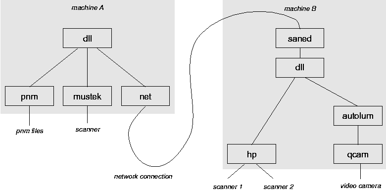 net ドライバもやはり仮想ドライバで、これはマシン B で動作している SANE デーモン(saned)に接続することにより、リモートスキャナへのアクセスを提供 します。さて、マシン B は、他のいくつかのドライバにアクセスするために 再び dll を使用します。ご想像のように、システム管理者は、マシン A と B を 正しく設定しないといけません。