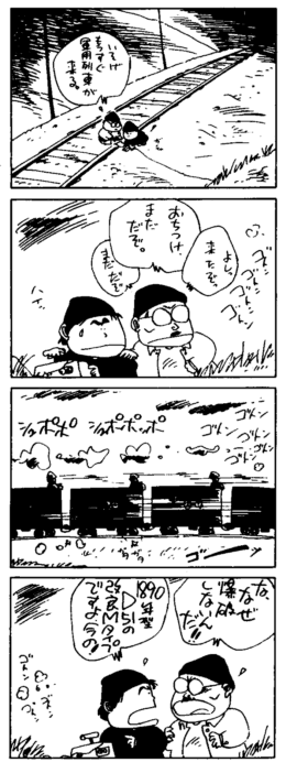 ただ、もう一つ重要な要素がある。戦前と戦後を比較した場合、鉄道を趣味の対象とする上での社会的な制約がなくなったのだ。その制約とは軍の存在である。 戦前、鉄道の隠れた使命の一つが軍事輸送であり、そのために鉄道に関する資料を収集することは「軍事機密」への抵触を意識しなければならなかった。国鉄のダイヤには、時刻表には掲載されない軍事列車が常に設定されていたし、「要塞地界」と呼ばれた地域では写真撮影などの行為に制限がついた。単に「軍隊があること」ではなく、その社会的な影響力の存在が、「趣味で鉄道を追求すること」への障害となっていたわけである。その裏には戦前の日本が「戦争」をどこかで意識した社会だったこと、その「戦争」への対応として軍の社会的なコミットメントを高める施策が採用されたことが要因としてあげられるが、ここでは詳述は避ける。 この日本のケースを参考に考えれば、鉄道趣味が社会的に存在する条件とは、経済的な余裕と、軍の影響力の少ない平和な社会であるということができそうだ。近年鉄道趣味が成立した台湾の場合も、そのきっかけは一九八七年の戒厳令停止とその後の民主化にあったといえる。 その点から見ると、韓国は北朝鮮との軍事的な緊張緩和が鉄道趣味成立の条件といえるし、中国の場合は政府や軍の社会的な「統制」がネックとなっている。(中国に返還された香港には鉄道趣味が存在するかもしれない)アフガニスタンは二重の意味で鉄道趣味から最も遠い国だと言うことになるだろう。 日本に限らず、一九世紀から二〇世紀半ばまでの間、鉄道はしばしば経済的・軍事的な利権を伴って建設・運営されるものでもあった。歴史教科書でおなじみの南満州鉄道や帝政ドイツが計画した3B鉄道(ベルリン・ビザンチン・バグダッド)などはその代表例である。軍隊が鉄道を利用する以前に、鉄道は軍事的な性質を合わせ持っていたともいえる。(より直接戦争と関わる装甲列車や列車砲というものもあった) それが第二次大戦後、他の輸送機関(自動車・飛行機)が発達し、鉄道の地位が相対的に下がった結果、鉄道は軍事利権という悪しきくびきからかなりの部分で解き放たれた。つまり「鉄道の斜陽化」と呼ばれる現象が、皮肉にも鉄道を平和な趣味の対象に変える契機にもなったわけである。 「戦争」が鉄道趣味と両立しない、という事実は、図の4コママンガに端的に表現されている。(より卑近な表現で、ということもできる) 「鉄道趣味を持つ工作員」というものがおよそ現実にいそうにないことが、このマンガのおかしみを生んでいるわけであるから。