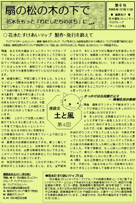「チーム土と風」が担当する第6号を発刊しました。今回は、花水たすけあいマップの制作をめぐる裏話や地域のボランティアの話題らついての座談会の記録を掲載しました。花水地区の公民館やひらつか市民活動センターをはじめとした公的機関などに置いてあります。