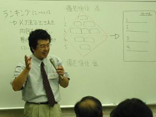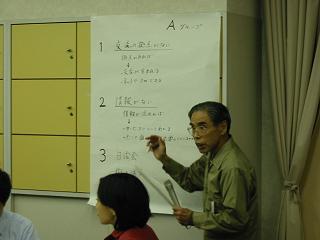 | 木原:くろす?どういう字? 交流:カタカナです。 木原:華に、らぶに、クロスっていうと、なんか違う世界に来た感じですね。本当にこれで、地域のこと考えるのかな、というような。そのくらい発想力が豊かな方がいいでしょう。えっ。行政の方から、待ったがかかりましたか?よろしいですね。次からは、このチーム名で呼んでいきたいと思います。 次の時には、リーダーを決めてください。広報部の必要性がありますので、各チームから最低1名、出してくださいね。次回からは、私の方は、離れてしまいますが、10月25日に「住民の助け合い実態を把握」の方法をお話しします。私の第1部の4回のワークショップはこれでおしまいになります。また、12月の中間ワークショップ、3月にまた来ます。皆さん、がんばって下さい。 |