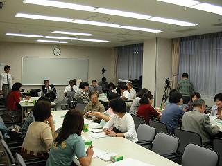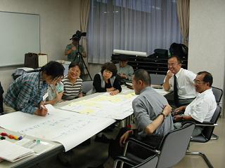 (チーム結成) 木原:みなさん感じるところは、同じだということがわかりました。普通こういうことは、こんな時間をかけてやらないんですね。だけど今回は県のモデルですから、ある程度理論を建てていかなければならない。結論として、生活者としてみてきた課題が、共通するということがわかりました。 まず、地域の拠点の話しがどのグループでも出ていました。まず第一に、場の問題、交流と拠点でチームを作りましょう。あるのに利用されていない、いつも決まった人しか使っていないという課題。また、拠点がない場合はどうするか、自分の家を開くとか、空き店舗を利用するとか、空いている空間を利用するとかを考えるグループが一つです。それから、2つめは、情報ですね。皆さんのお話しはリンクしていますね。拠点があれば情報が入ってくる、と。情報も出す側と受け取る側の両方に問題がありますね。実際に自分たちの足元を調査してみようという話しがありましたね。おっしゃるとおりだと思います。きっとそうであろうという話しであっても、実際に行ってみて話しを聞くことによって、なにが必要なんだということがわかる。三つ目は、分かれたような感じですが、環境問題。住環境の問題と、まちの活気と環境問題。この環境問題は、拠点の話しとつながるけど、日ごる生活している街の再発見のグループ。四つ目は、する側とされる側がぎすぎすしない関係にならないようにするには、どうすればよいか。人の問題が出ています。自治会やボランティアへの参加をどう進めるか、子育てとかがここに入ります。 とりあえず、この4つ、「交流」「情報」「環境」「人」をおおよその柱としますので、自分の関心で、自分は主にここに行きたい、という席に移動してください。全部関わりたいと言う方、選べないと言う方も、とりあえず移動してください。また、ゆっくり考えたあとで、チームを変えたいという方も、アンケートに書いていただければよいです。 人数は関係ないですよ、多くなったら二つに分けたりしますから。情報は多いですね。環境は、いませんか? 市:これからの進め方について、説明します。今後は、集まる日時はチームで話し合って決めてください。今後、チームで、まずチーム活動計画を立てることになると思います。課題によって、活動する中身は、異なってくると思われますが、基本的には、地域の人々へのインタビューによって実態を把握したり、地域を歩いて発見するというのが、典型的なやり方だと思っています。木原さんには、住民の助け合い実態を把握する場合のやりかたを学ぶ勉強会・相談会をお願いしてあり、10月25日に設定しています。 今回は、4月までですので、あまり時間はございませんが、市のほうでは、どこまでやりなさい、という指示はしません。できるところまでのまとめをお願いできればと思っています。課題やチームによって、いろいろ異なってくると思います。例えば、こういう現状を把握しましたよ、提言をまとめました、実践をしてみましたのでその報告をします、といろいろあると思います。それは、ばらばらで結構です。時間切れだよ。もっとやりたかったのに、という場合には引き続き続けていただくというのも、一つの選択肢かなというふうにも考えています。 活動の成果は、市で策定する地域福祉計画に反映していこうと思っています。この計画は、市の全体の計画ですので、それとは別に、地区の皆様や関係機関への報告の機会、といったものを設け、行政や地域で反映できるものは、そのための努力をしていきたいと思っています。また、チーム活動へのサポートも、出来る限りしていきたいと思っています。 最後に提案ですが、広報部ということで、地域の皆さんにこの活動を知っていただくことが大切ですが、これをチームの中でやるのも大変なので、有志によって、広報部をチームとは別に作るといいかなと思っています。 木原:チームのメンバーが入れ替わり雰囲気も変わりましたので、「交流」「情報」「人」の各チームで自己紹介をしてください。そして、チームの名称と、メンバーの名前と次の活動日を配布した用紙に書いてください。 |