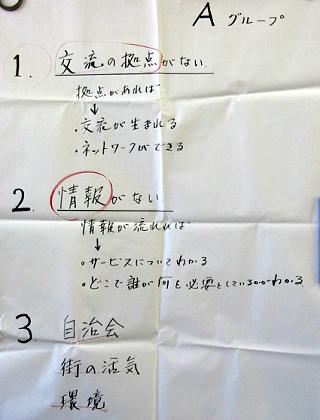 (Aグループ) 前回は、7つの島が出来ましたが、これを3つにまとめました。マンション暮らしで交流がないとか、街が暗くてやだね、というのをまとめて、「交流の拠点がない」としました。この会場みたいに立派なものはあるが、利用の仕方を知らない。あること自体を知らない方もいる。うまく使えば、交流が生まれる。それを利用すれば、ネットワークが出来るから、情報がないよ、福祉のサービスがないよ、というのも解決できるし、どこで誰が何を必要としているかもわかってくる。交流ができれば、自治会にも入ってくるし、街に活気が出てくるし、ゴミを捨てる人もいなくなる。中心として交流があって、これによってさまざまな課題が解決できるのでないかとまとめました。 ![]() |
