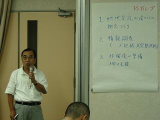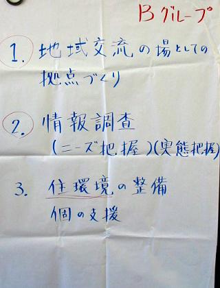 (Bグループ) こうやって3つのグループをみると、考え方は同じですね。そもそもの集まりが、福祉ということで集まりましたので、皆さんの考え方が同じなんだなあと言うことが、結論的に見えたような気がします。そして、皆さんが感じているのに、手をつけられていない問題があるなと感じました。1の交流の場は、行政で何年間もかけて相当のお金を使っているが、そのわりに使っている人が、限定される。せっかく地域のこういうグループができたのだから、斬新な場を作ってみたらどうか。集まっていけば、気が休まるという場を作る方法を考えてみようというものです。2の情報は、一体こういう場を必要とする人、福祉を必要とする人は、どういう人なんだろうということを、実際に私たちが足で稼いでみるのが最初ではないかと話しに出ました。ニーズ把握とありますが、あらかじめもらった既定観念の情報でなくて、足で探す情報をとってみようというものです。3は、その他、いろいろ重要な問題があるんだけど、まとめてこのようにしました。だいたい同じでしたね。4回のワークショップをやって、正しいことが見えてきたと言う感じがします。 ![]() |