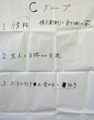 (Cグループ) 1の情報は、出す側と受ける側のつながりが生まれていない。出す側としても、どんな情報をどのように出せばわからないという問題を抱えている。生活者の方に情報が行き渡っていないのではないかということもある。2の大人と子供の交流は、子供と高齢者だけでなく、大人との交流がもっとあれば、ボランティアに参加したり、子供の元気が出てきたりとか、街の雰囲気がもっと良くなるのではないか。3は、ボランティアの受け手と担い手の役割分担が決まってしまっていて、だからこそ、自治会も同じ方々がやっていらっしゃるから役員が高齢化するし、新しいボランティアがでてこないのではないか。あなたはボランティアする人、あなたはサービスを受ける人という固定観念が出来ているのではないか、そうじゃなくて誰でもボランティアが出来るし、誰でもサービスを受けることが出来るというふうに考え方を変えた方がいいのではないかというものです。 ![]() |