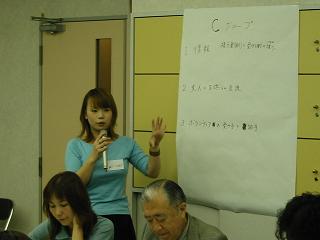 (グループ発表) 木原:各グループ3分ほどで、発表してください。その発表をもとに課題を整理して、それをもとに新たにグループ分けをするので、また新たな出会いがあります。にこやかにお願いします。 |