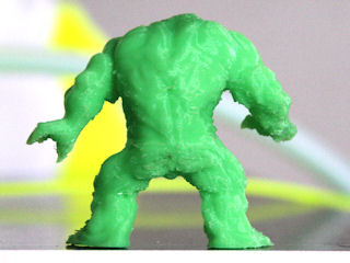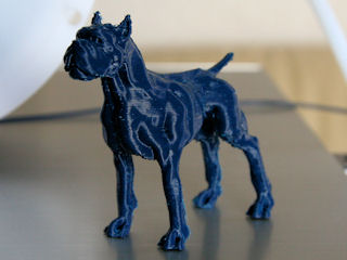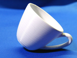 | Curaでの造形設定にも慣れたが、まだまだ品質向上の手立てがありそうである。 | フィラメントの径が1.75mmであるので、同一造形データであるので、より引き締まった造形となるが、問題なく造形出来る事が確認できる。 ABSであるので、反りの問題や造形中も積層物が柔軟に揺れ動くなどの課題もあるが、同一の温度設定で造形できるので利用し易い。 (2014/02/14) こちらのABSのフィラメントの使用時は、もう少し溶融温度を下げるべきだろう。 純正品のPLAのフィラメントは、やはり怪しい。 |