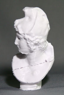 うまくいっていると思ったが、そう見えていたのはファンの風が当たっていた左側の顔だけで、右側は悲惨な状態であった。また、外形が一軌跡分だと強度不足の為、中味の形状の影響が表に出てしまう問題もある。 鼻の出来は今までの造形の中で最も良い状態であるけれど、冷却効果に偏りがある状態となってしまった。 次回は、顔の正面にファンの風が当たるように配置角度を変更しようと思う。 この結果からすと冷却は少なくとも左右の二箇所以上から行うようにした方が良い事が分った。 そういえば、二方向からの冷却用ファンを備えたと謳う造形装置が発表されていたっけ。 |