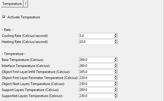 ■Activate Temperatureスイッチ - Rate - ■Cooling Rate(Celcius/second) : ■Heating Rate(Celcius/second) : - Temperature - ■Base Temperature(Celdcius) : ■Interface Temperature(Celdcius) : ■Object First Layer Infill Temperature(Celdcius) : ■Object First Layer Perimeter Temperature(Celdcius) : ■Object Next Layers Temperature(Celdcius) : ■Support Layers Temperature(Celdcius) : ■Supported Layers Temperature(Celdcius) : |