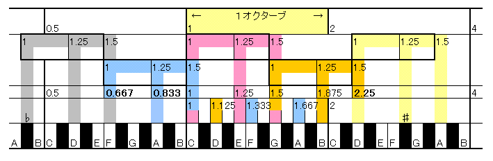 | 周波数倍率 | 小数 | 1.000 | 1.125 | 1.250 | 1.333 | 1.500 | 1.667 | 1.875 | 2.000 | |||||||||
