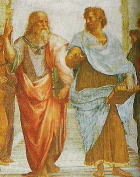 a イデア![]() ラファエロが描くプラトン(左)とアリストテレス(右) | プラトンの思想の中核となる言葉で、不完全な現実の世界に対して、完全で真実である世界をイデアといい、プラトンによればそれは実存するのだ、という。彼はそれを説明するのに、有名な「洞窟の比喩」を使う。つまり、仮に牢獄である洞窟に閉じこめられていて、外の世界を知らない人は、外界から差し込む光による影だけが現実のものとして映る。それと同じように、実際の人が見ている現実は、イデア界の影にすぎないのだ、という。このプラトンの考えは、師のソクラテスから引き継いだ、ソフィストたちの相対主義的を克服して絶対的な「真理の探究」をめざすものであった。その弟子のアリストテレスは、プラトンのイデア論に対し、現実を真実のものと見ることを主張した。両者の考えの違いは、大まかに言えばプラトンの観念論とアリストテレスの経験論という二つの大きな潮流の源流となり、後の西洋の哲学に流れ込んでいく。 Epi. ラファエロの『アテネの学堂』にみるプラトンとアリストテレス ルネサンスの画家ラファエロの作品にヴァチカン宮殿「署名の間」の壁画『アテネの学堂』がある。倫理の教科書などでお目にかかるかもしれない。その中央に描かれている二人、左がプラトンで右がアリストテレスである。その二人の手をよく見ると、プラトンは天上を指し、アリストテレスは地上をさしている。これはプラトンがイデア界に真理が存在すると主張したのに対し、アリストテレスが現実の中に真実があると反論していることを示している。アテネの学堂、つまりアカデメイアにおける二人の論争を描いているわけである。なお、この巨大な壁画にはギリシアの哲学者や科学者を描いているが、ラファエロや同時代の画家をモデルにしたという。一説には、プラトンはダ=ヴィンチをモデルにしたらしく確かにその自画像とよく似ている。 |
