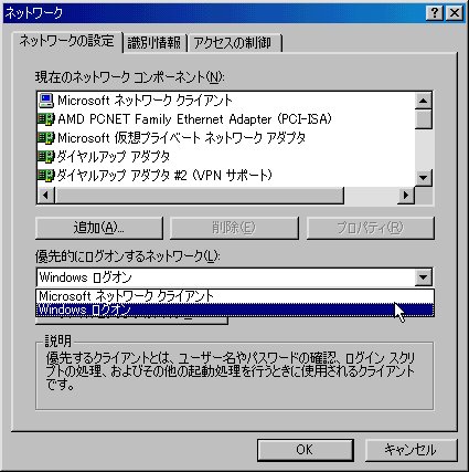 ネットワークをインストールすると、Windows起動時にパスワード入力ダイヤログボックスが表示されるようになります。これをスキップするには、[コントロールパネル]→[ネットワーク]→[ネットワークの設定]で、[優先的にログオンする]の項目を[Windowsログオン]に設定します。これで、次回起動時にはパスワード入力ダイヤログボックスが表示されなくなります。