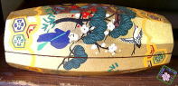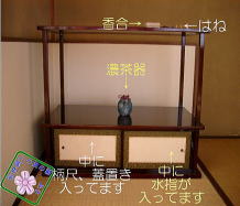 ![]() 紹鴎棚(大棚) 濃茶器が置かれている下の地袋の中には 向かって右側に「水指(みずさし)」が 向かって左側には「柄尺、蓋置き」が入っています。 棚物は、畳半畳ほどの大きさであれば「大棚」と呼び 写真の紹鴎棚のほかには、台子類、袋棚などがあります。 また小棚(さらに半分ほどの大きさの棚)も多々あります。 ほとんどの棚は 特に季節に関係なく使えますが 風炉がのせられない紹鴎棚、袋棚などは 自然と炉の時期となります。 |