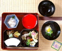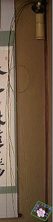 | −当日の流れ− 当日は晴天に恵まれ、Y先生のお宅の門から玄関、露地に至るまで打ち水がされており、とても清清しい厳粛な雰囲気です。 白湯(この日は、薄い昆布茶)で軽く口を湿らせた後、露地草履に履き替え、たばこ盆の用意と円座の敷いてある外腰掛に座って待っていると、亭主が「つくばい」付近に水を打ちます。その音が迎えの合図となり、個々に「つくばい」で手と口を清めた後、席入りします。 畳一畳6歩で歩き、釜・棚・床の間の掛け物、花(結び柳の写真あり)などを拝見した後、亭主と正客が挨拶を交わし、炭とりにて「初炭の点前」です。 続いてお食事(租飯と言うようです)で、一品一品がY先生のお気持ちが溢れるお料理を美味しく頂戴しました。(下方に写真あり) 中立ち(なかだち)も済み、主菓子(お饅頭)を頂いてから、「濃茶点前」の拝見と島台重ね茶碗(茶碗の中が金・銀で塗られた赤楽茶碗)で濃茶をいただいて、その後、干菓子で薄茶を頂戴して、茶事は和やかに楽しく無事終わりました。 今回の一連の流れを読んでいただいて、お気づきかと思いますが、私(あき)の先生宅で行われました初釜の茶事は、濃茶と租飯の順番が前後したり、あるいは、後炭をせずに薄茶をいただくというように、あくまでも臨機応変に行われております。昨年、ご紹介したページと若干異なるようでも、初釜という心躍る茶事に変わりはないのでご了承くださいませ。 茶事の空気が少しでも伝わりましたら幸いです。下の写真もご覧くださいね。 |