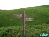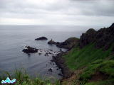 一つ目の頂上が見えてきた。5分ほど休憩して、先を急いで歩くことにした。2時過ぎから歩き始めた4時間コース。宿の食事が6時なので、それに間に合うように、ふもとまで急がねばならない。かなりのハイペースで歩く。 今度は下りになる。設置されてるロープにつかまりながら、ところどころ朝の雨でぬかるみもあって、滑りやすい。 足元に気を取られていると、突然海が眼前に広がる鉄府海岸である。晴れていたら素晴らしい海の色だったろうなぁ〜と少し残念に思いながらも、それでも満足だった。 足元は相変わらず滑りやすく、かなりの勾配があるので景色ばかりに気をとられていると転げ落ちそう。 それに、どうしたことかお目当てのナデシコの群生が見られない。確かに所々、ナデシコは咲いていたけれど、とても群生とは思えず、ちょっと膨れ顔。そのままひたすら歩く、歩く。