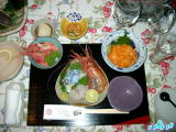 なんとか4時間コースを約3時間半で歩き、約束の場所まで宿の車が迎えに来てくれた。靴がドロドロになったけど、爽快だったなぁ!!!そして、待ちに待った夕食(下の写真は序の口よん)&岩風呂♪