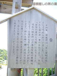 | 門の上には、「女人禁制」の文字。 神々の宿る神聖な場所とされているかなのでしょうか?? (現在は、女人も通行が許可されています(笑)。) 先端まで行く途中の道は、人ひとりが通れる程度の細道や、膝が笑っちゃうような橋(鉄骨なんだけど風に煽られ怖かった)を渡り、急な階段を下りました。 かなりの断崖なので、高所恐怖症の方は覚悟されたほうがヨロシイようです。 |